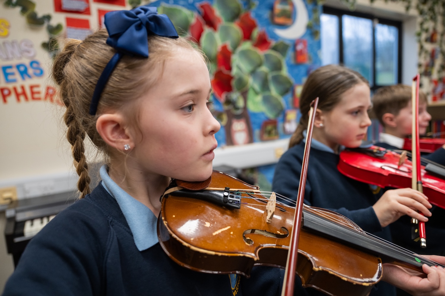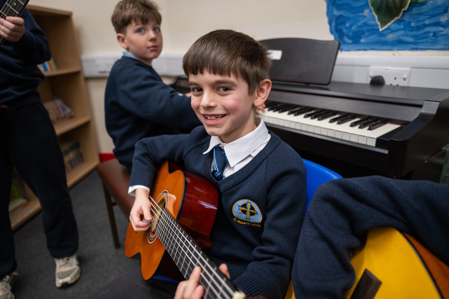 At Saint Aidan’s, the music curriculum ensures students sing, listen, play, perform and evaluate. This is embedded in the classroom activities as well as the weekly hymn practice, various concerts and performances and the learning of instruments. The elements of music are taught in the classroom lessons so that children are able to use some of the language of music to dissect it, and understand how it is made, played, appreciated and analysed. Through Sound start, students learn how to play an instrument. In doing so they understand the different principles of each method of creating notes, as well as how to read basic music notation. They also learn how to compose focussing on different dimensions of music, which in turn feeds their understanding when listening, playing, or analysing music. Composing or performing using body percussion and vocal sounds is also part of the curriculum, which develops the understanding of musical elements without the added complexity of an instrument.